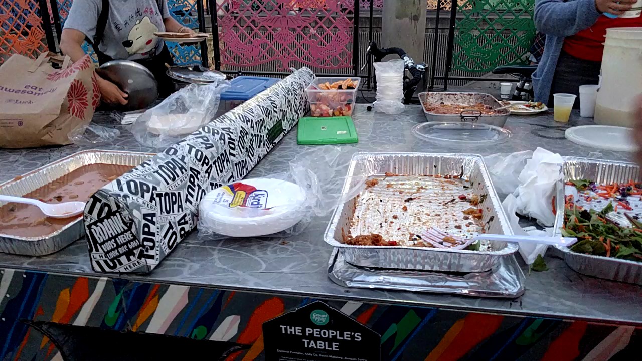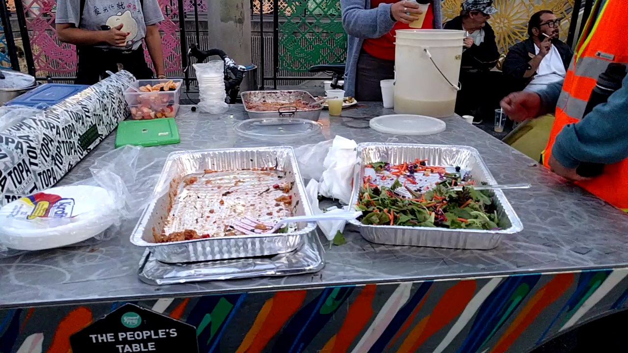 MEANWHILE, across the plaza was a glorious food serving! Some people came by with extra dishes that were going to be thrown out from a tech company’s catering abundance. A selfless tech employee and a bookstore staff person volunteered their time to feed the people. It was amazing, spontaneous, and beautiful.