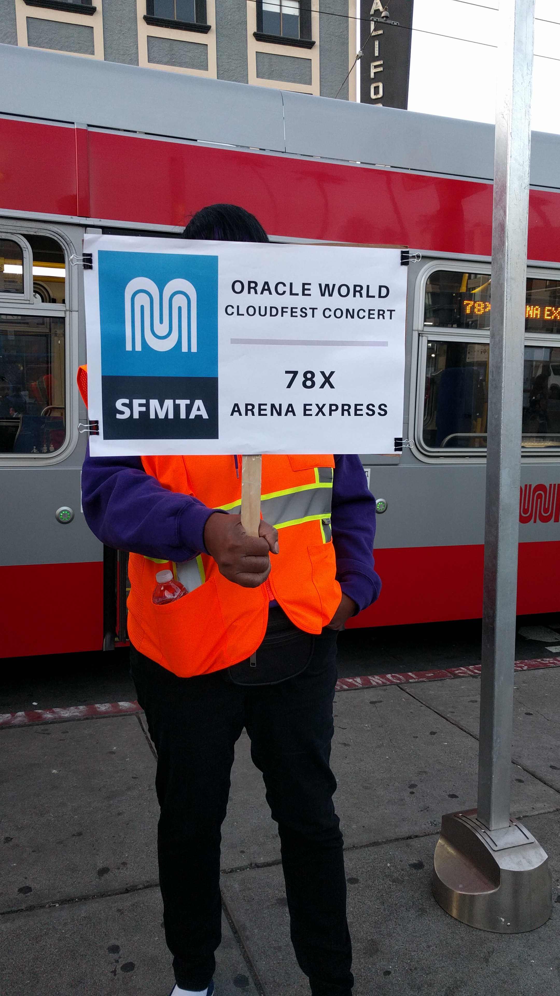 There was a strange sight at the 16th and Mission Bart Plaza: MUNI employees, funded by SFMTA public government money (i.e. your tax dollars) were holding up signs like chauffeurs for Oracle.