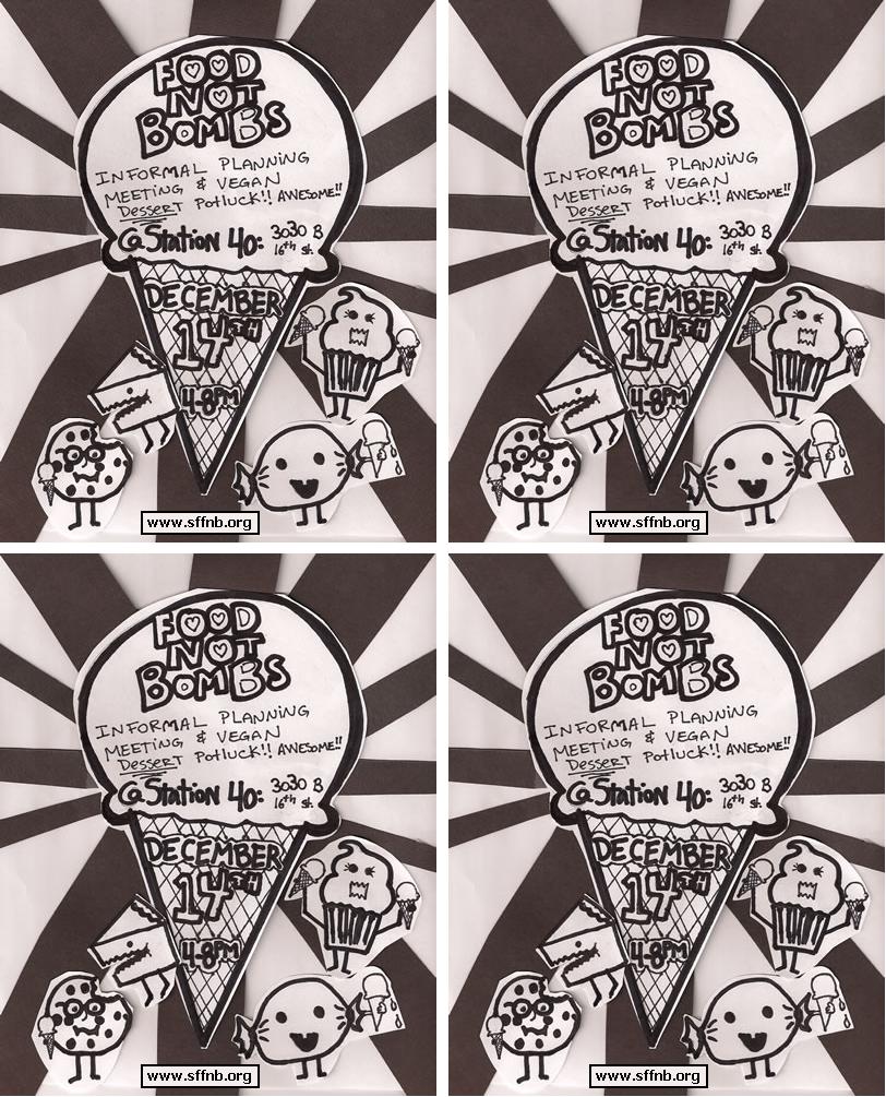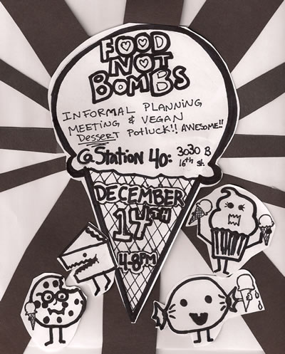 Join your fellow food not bombs organizers and friends for a night of fun and dessert. Whether you’re an old time volunteer or someone new, this is a great opportunity to learn more about what we do, meet your fellow activists, plan for the coming year and help our movement grow.